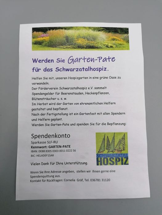 Wenn man nur noch wenig Zeit hat, ist es umso wichtiger, wie man sie verbringt. Am 07.05.22 findet ein großes Gartenfest im Hospiz Katzhütte statt. Der "neue" Garten wird in eine grüne Oase verwandelt, mit Grillplatz und auch einen Stellplatz damit die Patienten mit den Betten hingefahren werden können. Ich finde es wahnsinnig spannend wie es sich entwickelt! Und bin selbst schon aufgeregt wie es dann wohl aussieht. Vielleicht findet sich auch der eine oder andere der den Hospiz Garten mit unterstützen würde.. Jede Hilfe wird dankend angekommen!
