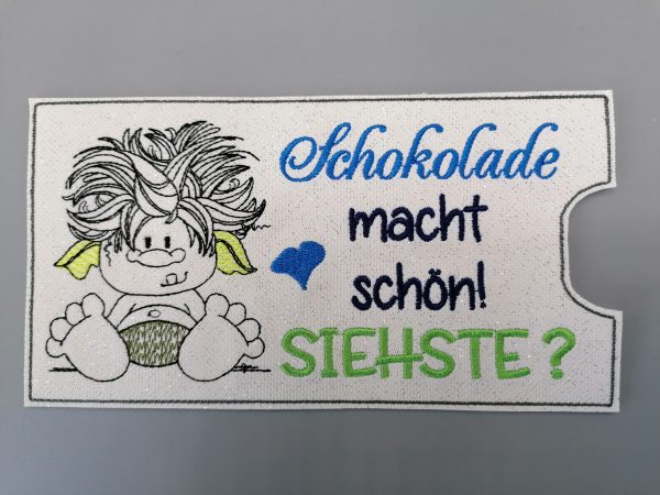 Die Schokoladenhülle ist auf Kunstleder gestickt, daher ist sie robust, abwaschbar und kann wieder verwendet werden.